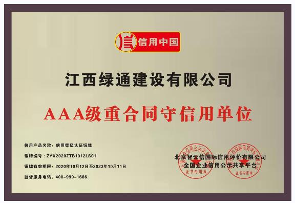 荣誉证书—AAA级重合同守信用单位—铜牌